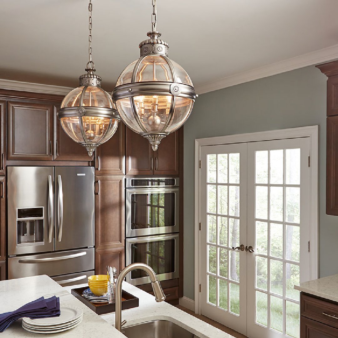 Постарайтесь не выбирать светильники слишком вычурной формы — ухаживать за ними будет очень сложно. Если «фонарь» украшен витыми деталями, не вешайте его над рабочей поверхностью — оттереть с завитков капли жира и приставшую к ним пыль почти невыполнимая задача.